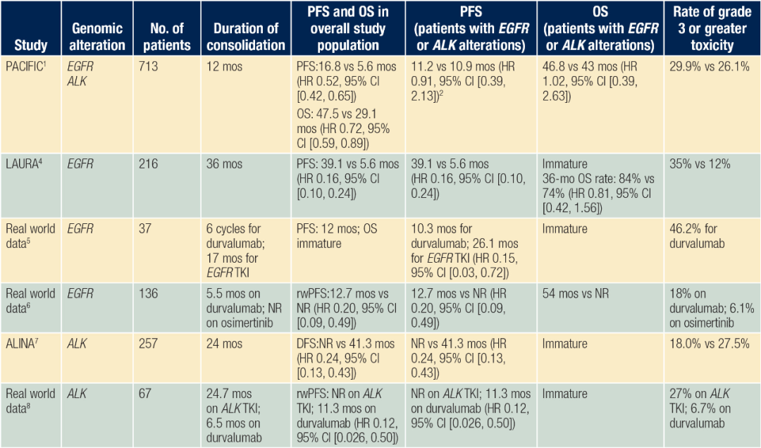 表1:EGFR和ALK基因变异患者的巩固免疫治疗研究[1,4-8]