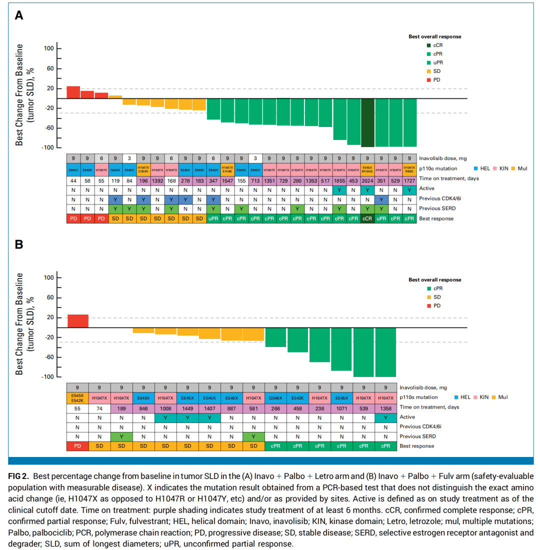 在该I/Ib期研究中,伊那利塞联合哌柏西利及ET展现出了可控的安全性特征,具有良好的耐受性、药物间相互作用(DDI),以及有前景且持久的初步抗肿瘤活性。这些数据表明,在PIK3CA突变、HR+/HER2-LA/mBC中,靶向ER、CDK4/6和PI3K通路药物的协同作用,并支持III期INAVO120研究进一步评估伊那利塞联合哌柏西利及氟维司群的疗效。