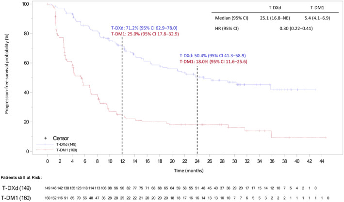 到数据截止日期(2022年7月25日),T-DXd组中位随访时间为29.0个月,T-DM1组中位随访时间为26.0个月。结果显示,T-DXd组与T-DM1组由盲法独立中心审查(BICR)评估的mPFS为25.1个月vs 5.4个月(HR=0.30;95%CI 0.22–0.41);12个月PFS率为71.2%vs 25.0%,24个月PFS率为50.4%和18.0%。