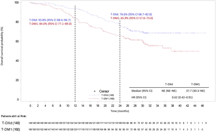 T-DXd组与T-DM1组mOS为未达到(95%CI NE–NE)vs 37.7个月(95%CI 30.3–NE)(HR 0.62;95%CI 0.42–0.91);两组12个月OS率为93.8%vs 84.0%,24个月OS率为76.6%vs 65.9%。