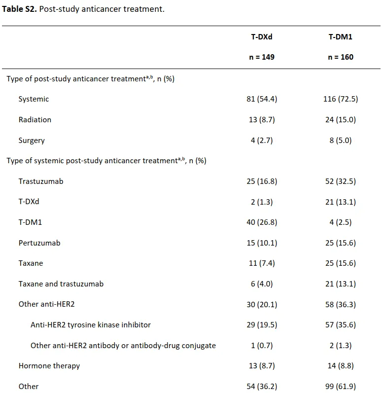 在后续治疗方面,研究期间,T-DXd组和T-DM1组分别有112例患者(76.2%)和149例患者(93.7%)中止了治疗。在治疗完成后,T-DXd组和T-DM1组分别有81例患者(54.4%)和116例患者(72.5%)接受了新的系统治疗,包括曲妥珠单抗、T-DXd、T-DM1、其他抗HER2治疗以及其他系统性治疗。至数据截止时,T-DXd组与T-DM1组分别有34例患者(22.8%)和55例患者(34.3%)在后续的系统治疗中出现了疾病进展(PD)。研究者评估的从随机化到下一线治疗首次记录到疾病进展的mPFS2在T-DXd组和T-DM1组分别为41.2个月vs 19.6个月(HR 0.46;95%CI 0.32–0.65)。