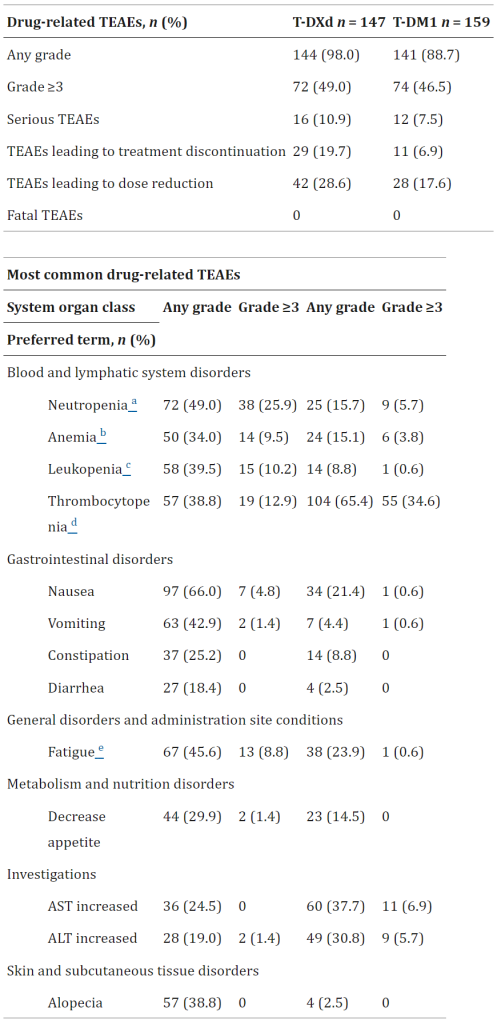 安全性方面,T-DXd的中位治疗持续时间为15.4个月(范围0.7–44.0),T-DM1为5.5个月(0.7–39.3)。对T-DXd组147例患者和T-DM1组159例患者的安全性评估显示,药物相关的≥3级治疗相关不良事件(TEAE)发生率为49.0%vs 46.5%,药物相关的严重TEAE为10.9%vs 7.5%,未见药物相关TEAE导致的死亡。T-DXd最常见的≥3级药物相关TEAE为中性粒细胞减少(25.9%)、血小板减少(12.9%)、白细胞减少(10.2%)、贫血(9.5%)和疲劳(8.8%);T-DM1最常见的≥3级药物相关TEAE则为血小板减少(34.6%)、天冬氨酸氨基转移酶升高(6.9%)、丙氨酸氨基转移酶升高(5.7%)和中性粒细胞减少(5.7%)。
