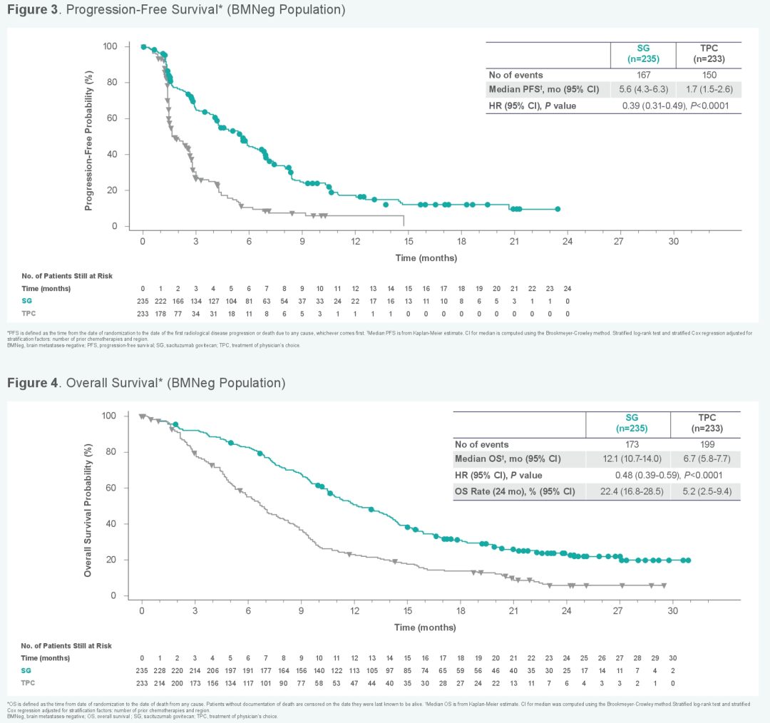 该适应症的获批主要基于多中心、随机、对照Ⅲ期ASCENT研究的结果。该研究纳入了529例紫杉类经治后进展的TNBC患者,按1:1随机分组后分别予以SG以及医生选择的治疗方案(TPC,包括卡培他滨、艾立布林、长春瑞滨或吉西他滨),直至出现疾病进展或不可耐受的毒性,主要研究终点为无脑转移人群的PFS,该人群患者共纳入了468例。最终疗效分析显示,在无脑转患者中,SG较TPC提升mPFS 3倍以上,为5.6个月vs 1.7个月,HR 0.39,95%CI:0.31~0.49,P<0.001;延长mOS接近2倍,为12.1个月vs 6.7个月,HR 0.48,95%CI:0.38~0.59,P<0.0001[10]。事后分析显示,无论Trop-2表达水平高低,患者均可从SG治疗中取得获益[11]。