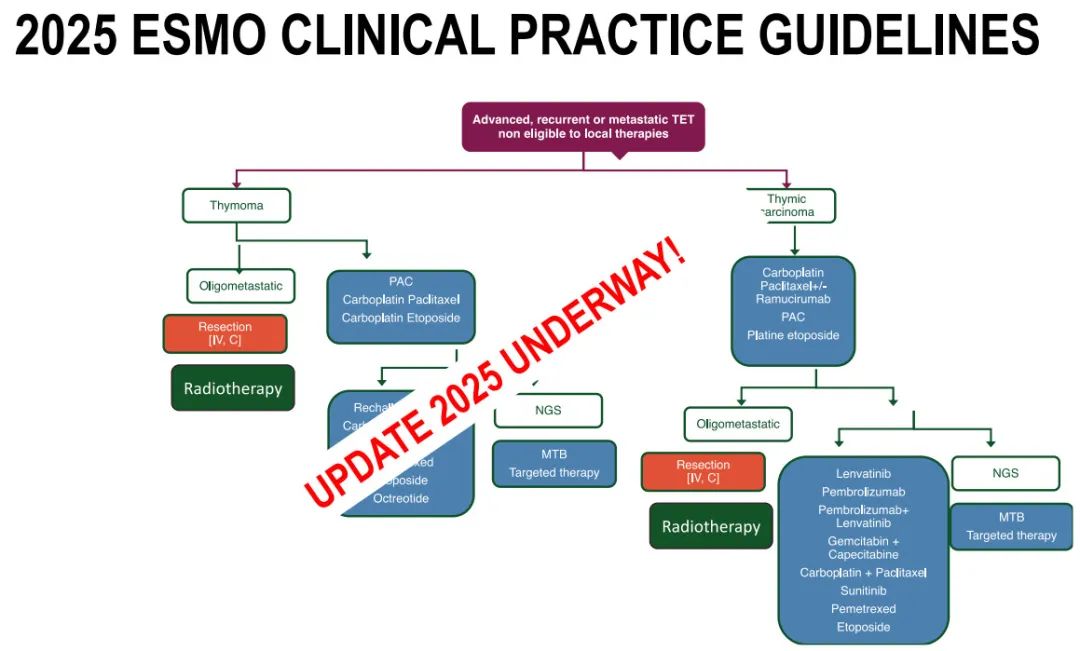 Dr Girard:A lot is coming in thymic epithelial tumors.We have the historic cytotoxic chemotherapy regimens for the first-line treatment of patients with advanced metastatic thymic tumors.We have some new trials combining chemotherapy(carboplatin-paclitaxel)with antiangiogenic agents,including ramucirumab,and bevacizumab.This may be one option for those patients.We have also seen data with combination of chemotherapy plus antiangiogenic agents,a triad of carboplatin plus paclitaxel plus ramucirumab,reporting quite prolonged progression-free survival,which is probably the best endpoint in these patients.There is movement away from chemotherapy alone to combinations of chemotherapy plus antiangiogenic agents plus immunotherapy.In the second-line setting,we have chemotherapy,we have antiangiogenic agents,sunitinib for thymoma,lenvatinib for thymic carcinoma,immune checkpoint inhibitors as single agent or combined with antiangiogenic agents.Again,the combinations and sequence are moving.What is good is that we have more options for the management of those patients.