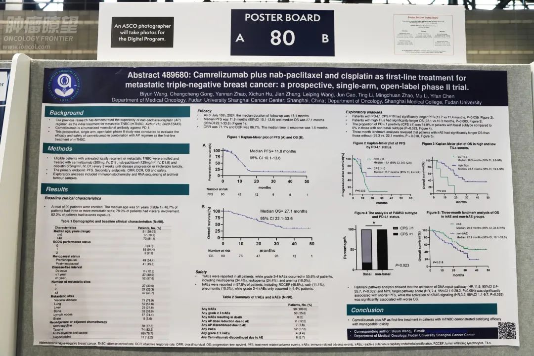 编者按:2025年ASCO年会于5月30日-6月3日在美国芝加哥举行,肿瘤领域多项研究结果进行公布。本届年会上,复旦大学附属肿瘤医院王碧芸教授团队的两项研究在会上进行展示,其中一项前瞻性、单臂II期临床研究(摘要号:1101)探索了卡瑞利珠单抗联合白蛋白紫杉醇和顺铂(AP方案)作为转移性三阴性乳腺癌(mTNBC)一线治疗的疗效与安全性。结果显示,入组患者中位PFS达11.8个月,中位OS为27.1个月,且毒性可控。其团队开展的另外一项正在进行中的临床研究方案也在会上进行了公布(摘要号:TPS1122),这项单中心、II期临床试验旨在通过68Ga-FAPI PET-CT评估肿瘤代谢异质性来预测HER2阳性乳腺癌脑转移患者对T-DXd治疗的反应,并分析稳定与活动性脑转移之间的差异,目前该研究正在积极招募患者中。本文特对两项研究进行介绍。