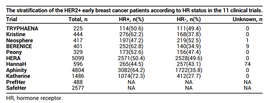 [2]、Hongmei Zheng,et al.The difference of clinical and molecular characteristics between HR-positive/HER2-positive and HR-negative/HER2-positive early breast cancer:A secondary analysis of 11 clinical trials..2025 ASCO.Abstract 533.
