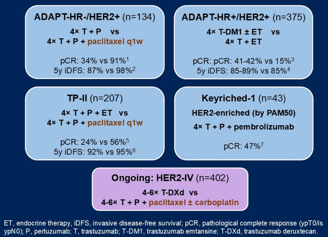 姚峰教授:曲帕双靶显著提高了HER2阳性早期乳腺癌的新辅助疗效,临床也在探索“降阶梯”治疗策略,包括前面提到的“去卡铂”THP方案,乃至这次ASCO大会报道WSG汇总分析的“去化疗”方案。WSG平台试验中,除了单纯HP方案以外,也有ADC(如T-DM1、T-DXd)单药以及HP联合免疫治疗等“去化疗”方案。
