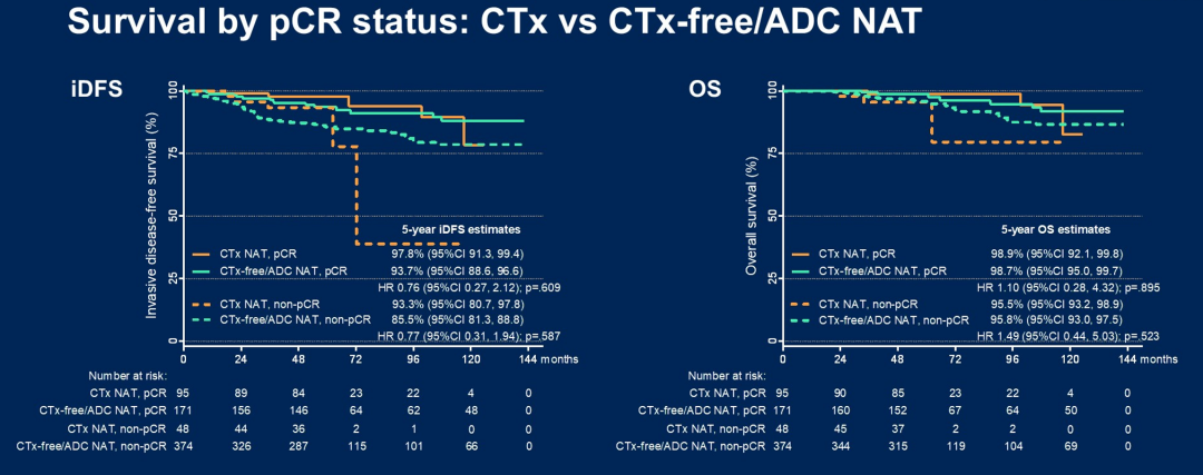 这次汇总HP和ADC的数据显示,有相当一部分患者(31.4%)使用“去化疗”新辅助治疗获得pCR,而且部分“去化疗”新辅助治疗达到pCR的患者后续也不再接受辅助化疗。值得注意的是,在达到pCR的患者中,无论有化疗还是无化疗新辅助治疗的患者,iDFS(HR 0.76,P=0.609)和OS均无显著差异(HR 1.10,P=0.895)。这些结果同样表明,部分患者是可以采取“去化疗”新辅助乃至辅助治疗的。