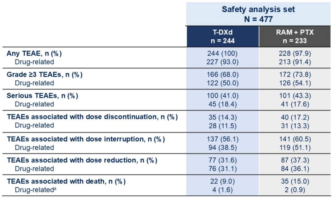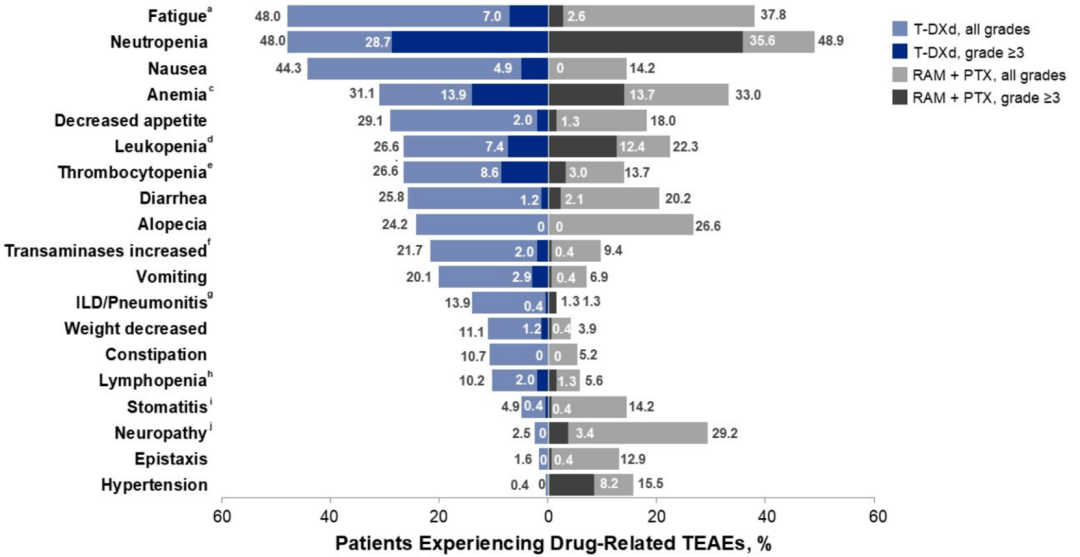 此外,T-DXd的安全性良好,不良事件可管可控,其≥3级的治疗期间不良事件(TEAEs)(68.0%vs 73.8%)、严重TEAEs(41.0%vs 43.3%)发生率均低于RAM+PTX组;且耐受良好,导致停药、剂量中断、减剂量的TEAEs发生率均低于RAM+PTX组。T-DXd的不良事件谱与既往报道一致,主要表现为中性粒细胞减少、贫血、白细胞减少等血液毒性,总体上低于或相近于RAM+PTX组(图2)。