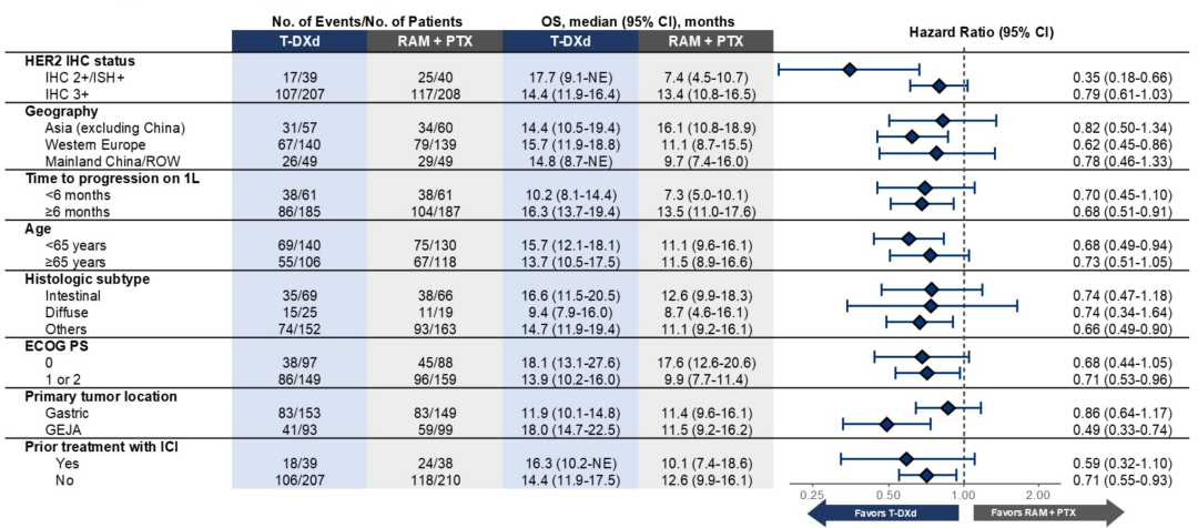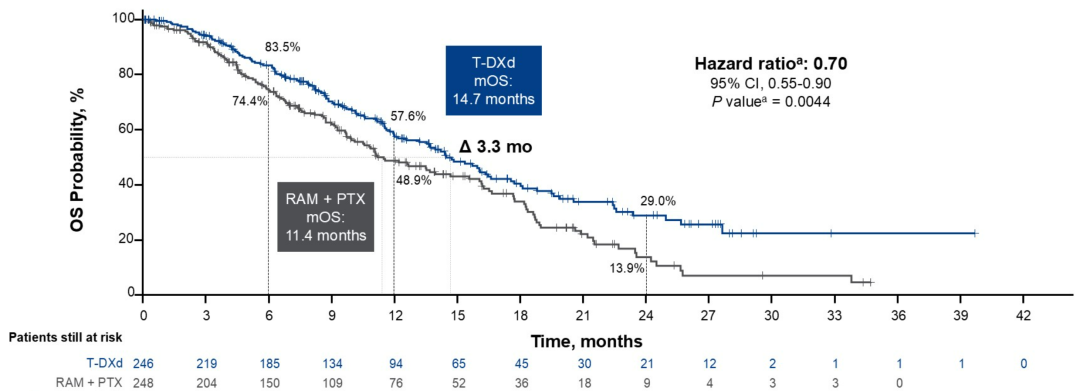 此次ASCO大会报道的中期分析数据显示达到了主要终点,T-DXd组患者的中位OS达到了14.7个月,相较于RAM+PTX组延长3.3个月(14.7 vs 11.4个月),死亡风险显著降低30%(HR 0.70,95%CI:0.55-0.90,P=0.0044)。值得注意的是,RAM+PTX组有25.8%的患者后续接受了HER2 ADC治疗,其中21.0%的患者接受了T-DXd后续治疗。在删除后续治疗影响后,T-DXd组相较于RAM+PTX组的死亡风险降低幅度扩大至36%(HR 0.64,95%CI:0.44-0.93)。