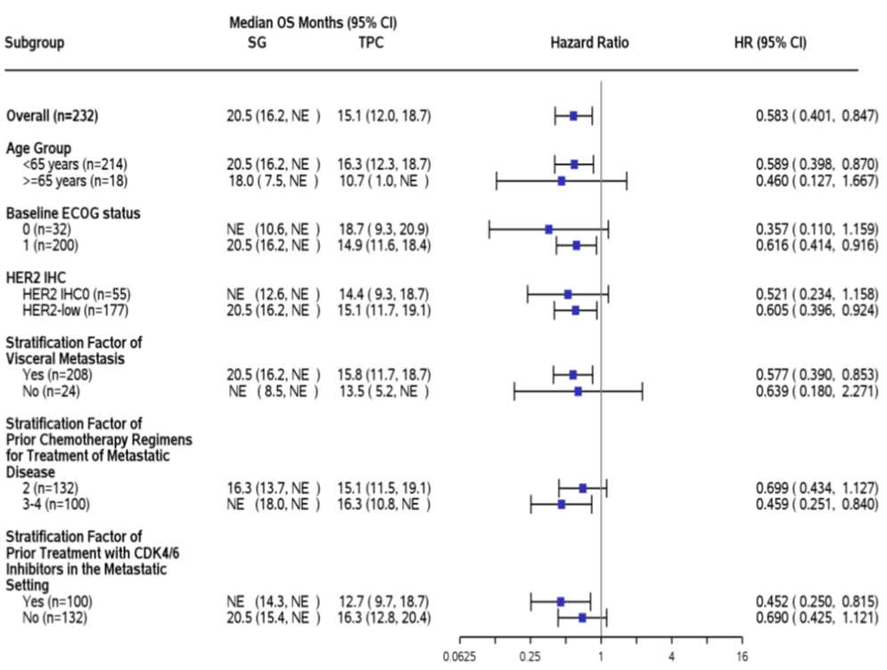 在OS方面,戈沙妥珠单抗较TPC同样取得了有临床意义的改善,为20.5个月vs 15.1个月,HR 0.583(95%CI:0.401-0.847),降低了41.7%的死亡风险,较全人群降低死亡风险程度(HR 0.64)具有更大获益的趋势。亚组分析显示,年龄<65岁、基线ECOG评分1分、HER2低表达、存在内脏转移、转移性阶段前序化疗3-4线患者、CDK4/6i经治患者显示了更大的OS获益趋势。