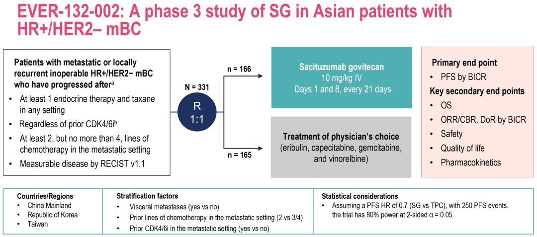 EVER-132-002研究是一项针对既往2-4次化疗经治的HR+/HER2-转移性乳腺癌的Ⅲ期、多中心、随机对照研究,共入组331例亚裔患者(中国大陆约70%),其中约50%的患者接受过CDK4/6i治疗,将患者按1:1随机分组后分别予以戈沙妥珠单抗或TPC治疗。2024年,由中国医学科学院肿瘤医院徐兵河教授作为第一作者,在《Nature Medicine》披露了该研究的初步结果,验证了戈沙妥珠单抗在亚裔患者的疗效、安全性以及生活质量[2]