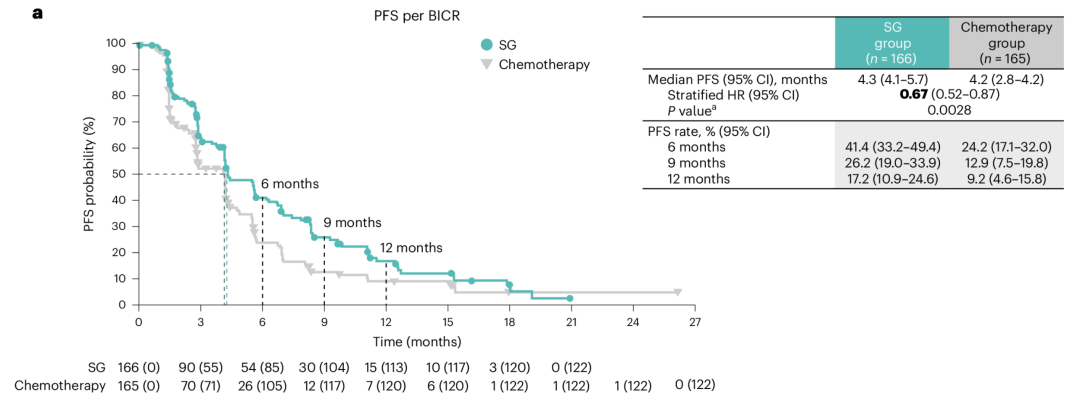 中位随访13.6个月显示,戈沙妥珠单抗较TPC改善了盲法独立中央审查(BICR)评估的mPFS,为5.5个月vs 4.1个月,HR 0.622(95%CI:0.457-0.846);研究者评估的mPFS为5.7个月vs 4.1个月,HR 0.550(95%CI:0.411-0.736);且各亚组获益一致。戈沙妥珠单抗为中国人群带来的PFS获益在绝对值方面及HR改善方面较整体人群具有优势趋势。