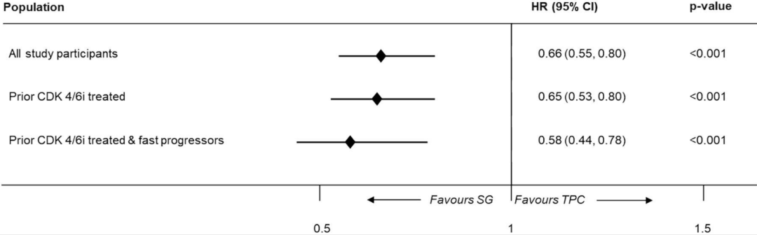 在总体人群OS方面,戈沙妥珠单抗同样优于TPC,为16.20个月vs 12.71个月,HR 0.66(95%CI:0.55-0.80),P<0.001,降低了34%的死亡风险。无论既往CDK4/6i经治患者是否跨快速进展,戈沙妥珠单抗同样可以取得OS获益。