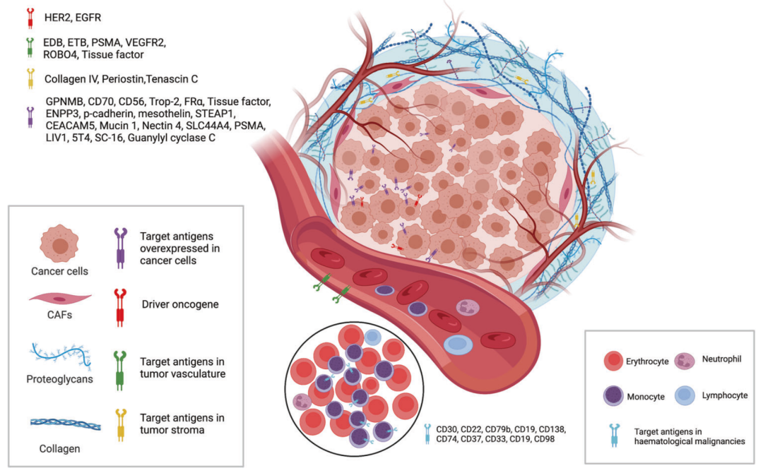 △ADC的关键靶标抗原主要来源于肿瘤细胞(过表达基因及驱动基因相关抗原)和肿瘤微环境(血管系统和间质组织)(图源:参考文献[1]