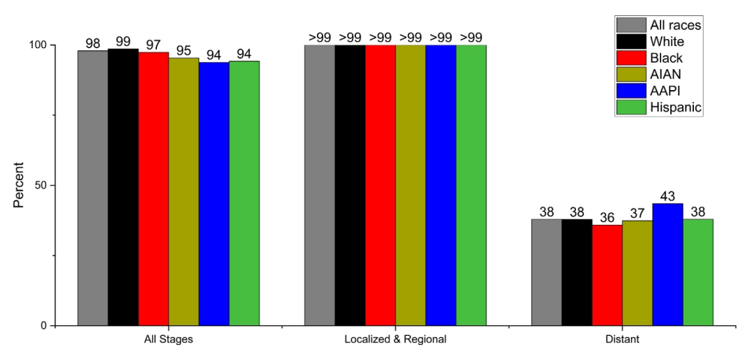 白人男性的生存率最高(99%;图3),亚裔美国人和太平洋岛民(AAPI)和西班牙裔男性的生存率最低(94%),这部分反映了后两者群体中早期诊断比例较低(图4)。AIAN男性最有可能在远处转移阶段被诊断(12%,而白人男性为8%),这可能至少部分反映了与其他男性相比筛查普及率较低。所有被诊断为远处转移疾病的男性,其5年生存率从黑人男性的36%到AAPI男性的43%不等。然而,在这些广义定义的种族群体内部存在很大差异;例如,AAPI各族裔的5年相对生存率从日裔男性的97%到汤加裔男性的58%不等。