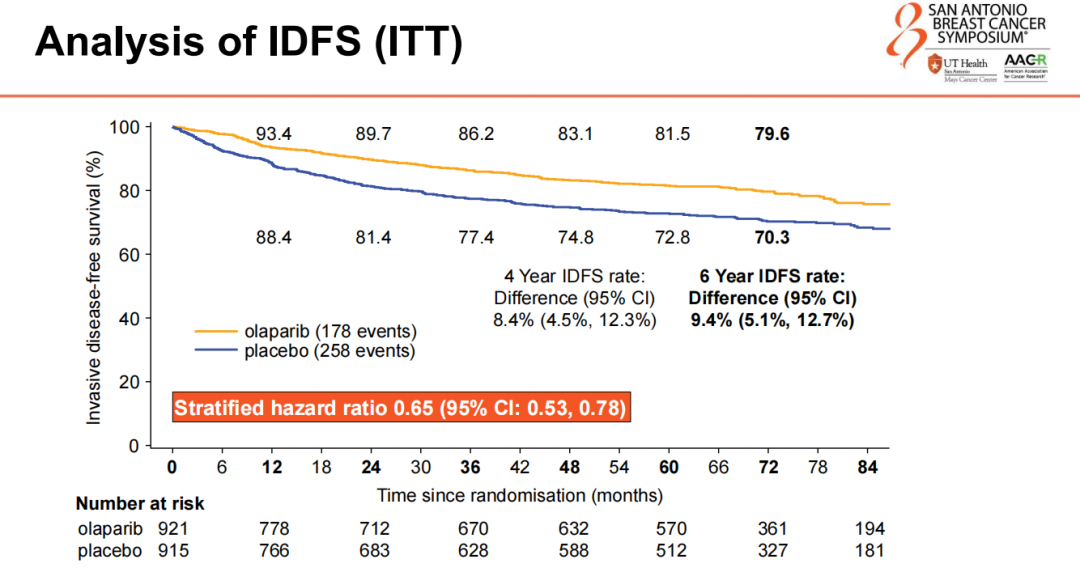 经过6年随访,奥拉帕利组与安慰剂组的无浸润性疾病生存率(iDFS)差异达9.4%(79.6%vs.70.3%,HR 0.65,95%CI:0.53-0.78),4年时的iDFS差异为8.4%。长期随访进一步证实,奥拉帕利可为早期患者带来持续的生存获益。此外,在意向治疗(ITT)人群中,奥拉帕利组也显示出远处无转移生存(DDFS)的改善,两组6年DDFS率为83.5%vs.75.7%,绝对获益7.8%(HR 0.65,95%CI:0.53-0.81)。总生存(OS)方面,奥拉帕利组6年OS率为87.5%,安慰剂组为83.2%,绝对获益4.4%(HR 0.72,95%CI:0.56-0.93),说明其可进一步改善患者的总生存。