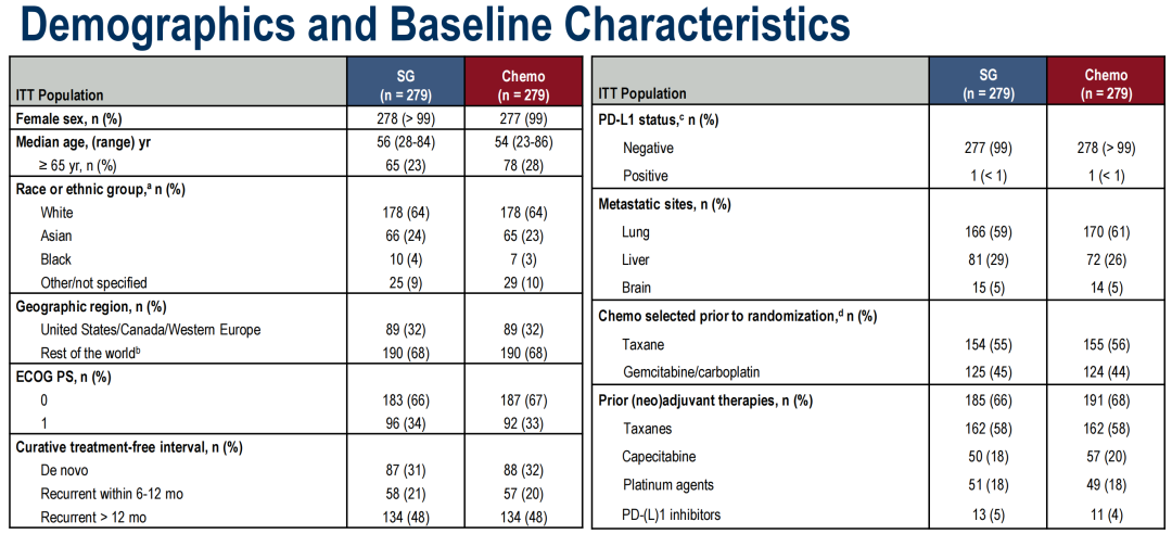 徐兵河教授:ASCENT-03是一项全球多中心III期临床试验,旨在探讨单药SG用于不适合免疫治疗的未经治mTNBC的疗效和安全性。不适合免疫治疗的患者包括:PD-L1阴性(CPS<10),PD-L1阳性(CPS≥10)且既往接受过PD-(L)1抑制剂早期治疗,以及由于其他合并症而无法耐受PD-(L)1抑制剂。入组患者随机(1:1)接受SG单药(10 mg,D1/8,q3W)或化疗(紫杉醇或白蛋白紫杉醇或吉西他滨+卡铂),化疗组经BICR确认疾病进展且符合条件的患者可二线接受SG治疗。研究的主要终点是独立盲法中心评审(BICR)的无进展生存期(PFS),次要终点包括总生存期(OS)、客观缓解率(ORR)、安全性等。研究设计及入组患者基线特征如下图所示。