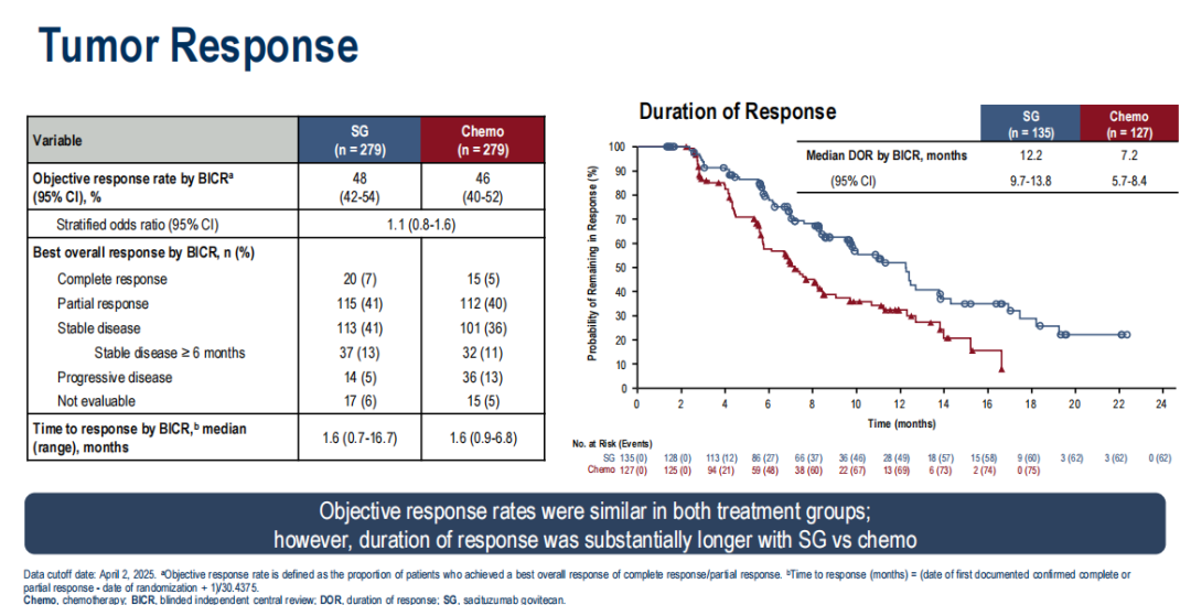 研究结果显示,主要终点:BICR评估SG组的中位PFS相较于化疗组延长2.8个月,疾病进展或死亡风险显著降低38%(9.7 vs 6.9个月,HR 0.62,95%CI:0.50-0.77,P<0.0001),各个亚组均呈现一致的获益趋势。