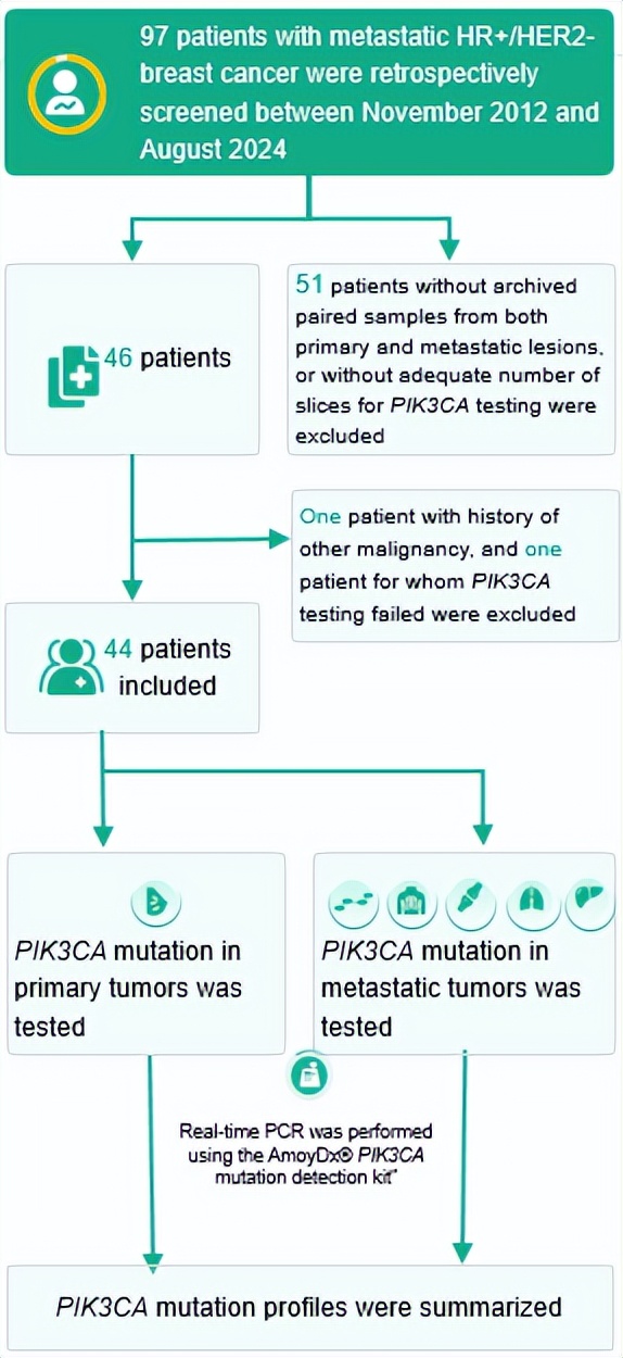 本项研究系统分析在吉林省肿瘤医院治疗的44例中国HR+/HER2-转移性乳腺癌患者的配对原发和转移肿瘤样本中的PIK3CA基因突变状态及热点分布特征。通过实时荧光PCR检测,并结合详细的患者基线特征,本研究旨在阐明原发灶与转移灶PIK3CA突变的分布规律、一致性及其对后续治疗决策的潜在影响,为进一步优化个体化诊疗提供循证基础。