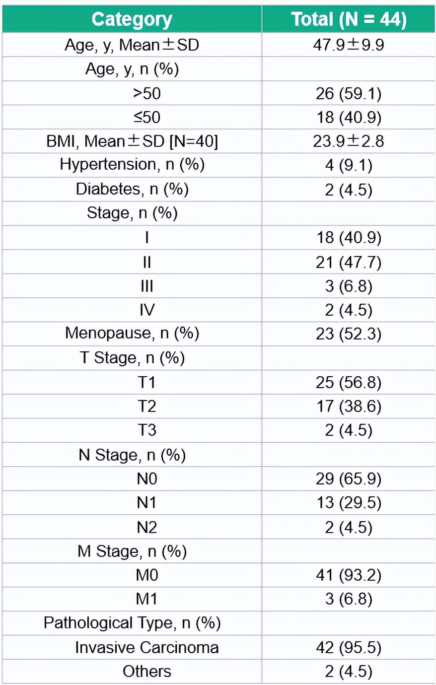 表1.患者基线特征(包括年龄、BMI、分期、绝经状态、病理类型等)