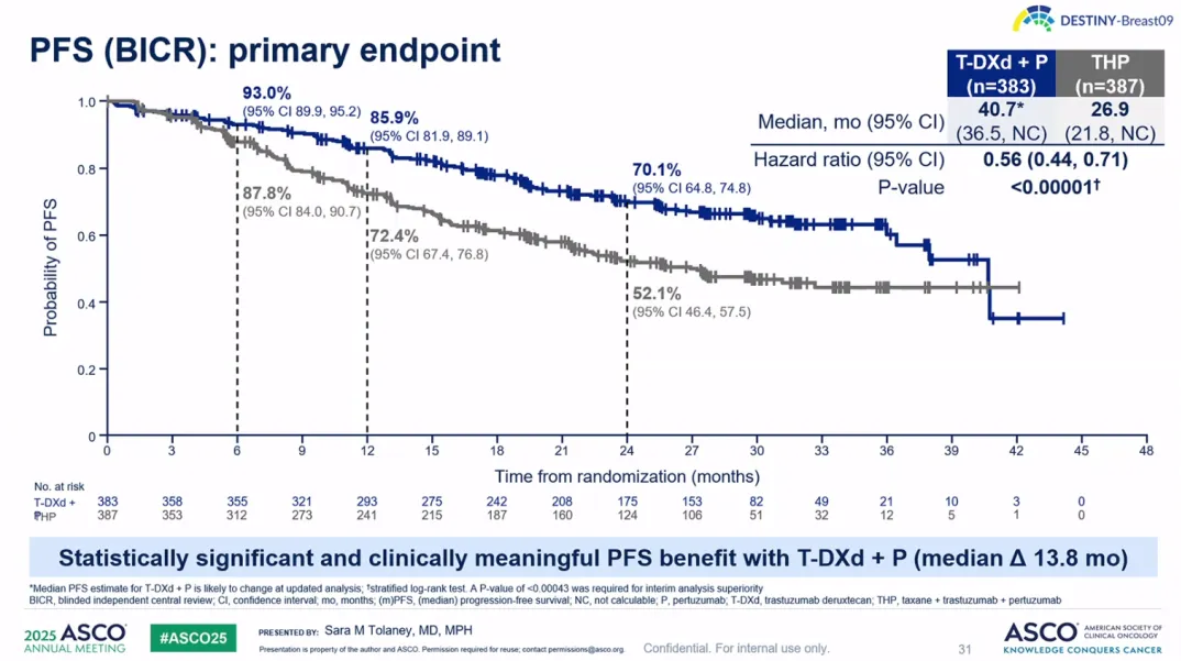 DB-09首次头对头挑战THP成功。这项国际多中心Ⅲ期研究纳入晚期阶段未经系统治疗的HER2阳性转移性乳腺癌患者,1∶1∶1随机分至T-DXd单药、T-DXd+帕妥珠单抗(P)或THP,主要终点为BICR评估PFS。2025 ASCO公布全球数据:T-DXd+P组mPFS 40.7个月,较THP延长13.8个月,HR 0.56,疾病进展或死亡风险降44%;ORR 85.1%,CR率15.1%;PFS2和OS均呈早期获益趋势。中国亚组(n=273,占23.6%)mPFS,NR(未达到)vs 27.4个月,HR 0.51,ORR 95.5%,CR率21.6%,均与全球人群保持一致获益[3]。