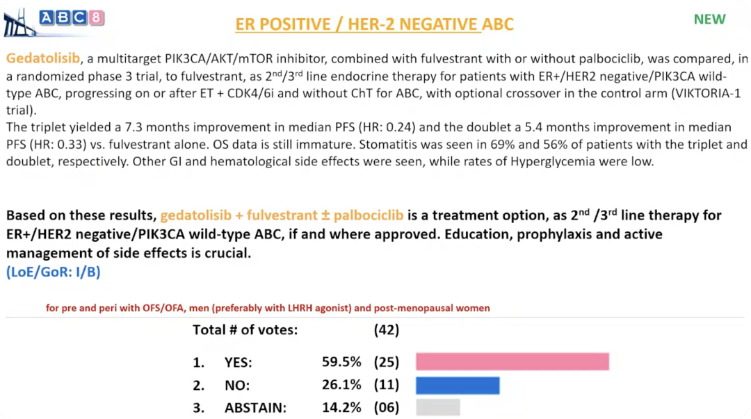 编者按:第八届晚期乳腺癌国际共识会议(ABC8)于当地时间2025年11月6~8日在葡萄牙里斯本举行。ABC共识指南是晚期乳腺癌领域首屈一指的国际性权威指南,汇聚了全球晚期乳腺癌领域的“意见领袖”级别专家,基于最新的循证医学证据对前沿和热议话题进行投票以达成共识,为全球晚期乳腺癌临床实践的革新和规范提供指导意见。肿瘤瞭望对ER+/HER2-晚期乳腺癌诊疗章节的专家意见和投票结果整理如下。