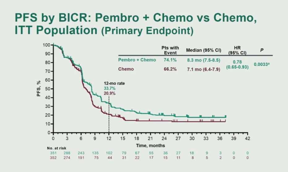 KEYNOTE-361是一项全球多中心开放标签的3期RCT研究,比较晚期尿路上皮癌应用Pembrolizumab联合化疗对比单用化疗的有效性和安全性。试验总共入组了21个国家的1010名晚期或无法手术切除的尿路上皮癌患者,其中膀胱癌占了80%,分别以1:1:1入组Pembrolizumab联合化疗、单用Pembrolizumab以及单用化疗。研究主要终点有两个,分别是PFS和OS。