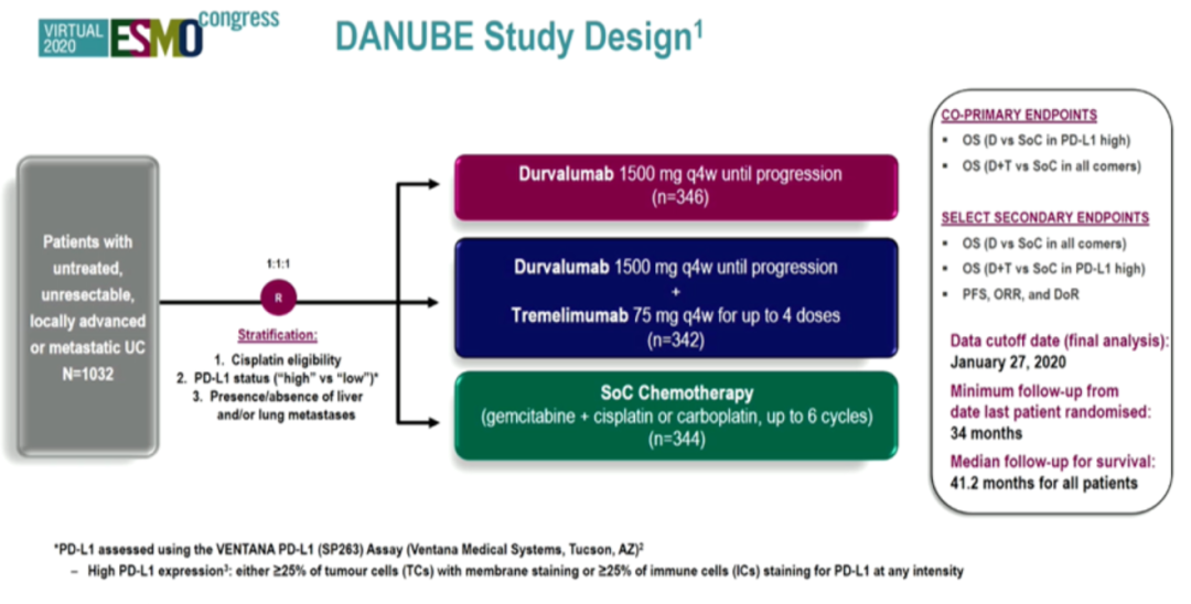DANUBE也是一项全球多中心开放标签的3期RCT研究,比较晚期尿路上皮癌应用Durvalumab联合Tremelimumab双免疫联合治疗对比单用Durvalumab或单用化疗的有效性和安全性。试验总共入组了1032名晚期或无法手术切除的尿路上皮癌患者。该研究分别以1:1:1入组Durvalumab联合Tremelimumab双免疫联合治疗、单用Durvalumab以及单用化疗。