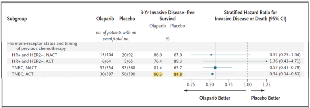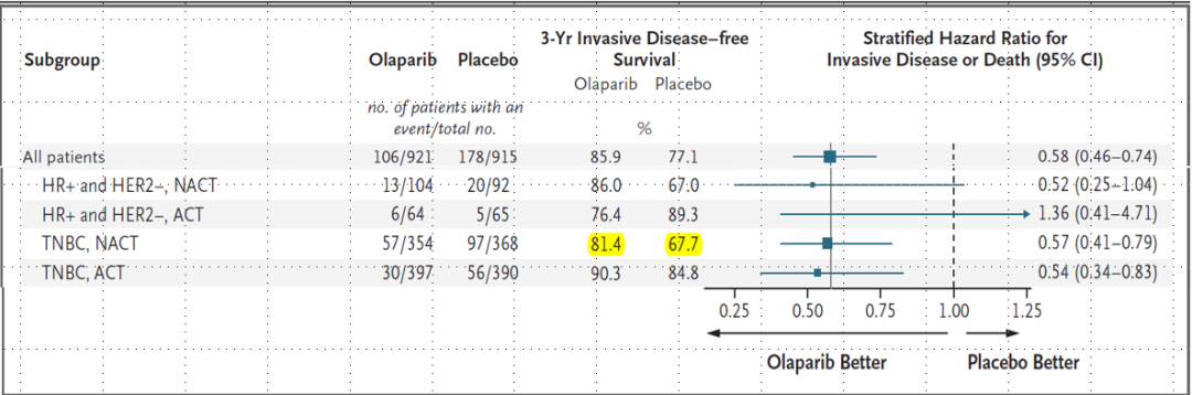 OlympiA研究纳入了722例新辅助化疗后三阴乳腺癌患者(占三阴乳腺癌47.8%),其入组要求是“新辅助后non-pCR”。我们可以看到BRCA胚系突变的三阴乳腺癌经新辅助化疗(请注意:93.7%患者接受的是蒽环紫杉联合方案)后non-pCR患者奥拉帕利组3年iDFS绝对提高惊人的13.7%,iDFS事件发生风险降低47%。(见图3)