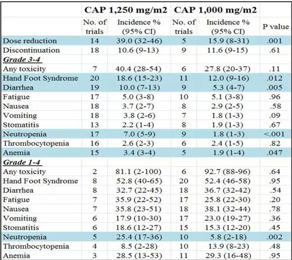 研究概况:这项荟萃分析比较的是卡培他滨初始剂量1250 mg/m2和1000 mg/m2的安全性和不良反应。研究者检索了1966年~2014年发布的文献和大会摘要,对其中使用卡培他滨单药治疗乳腺癌、安全性资料齐全的研究进行了系统回顾。最终纳入分析32项试验(12项III期试验,20项II 期试验)、4283例患者。这些研究中29项为局部晚期或转移性乳腺癌领域、2项为新辅助治疗领域,1项为辅助治疗领域。3065例患者初始接受卡培他滨治疗的剂量为1250 mg/m2,1218例患者为1000 mg/m2。分析结果显示,1000 mg/m2剂量组中减量、严重手足综合征、腹泻、中性粒细胞减少和贫血以及各个程度的中性粒细胞减少的发生率均显著低于1250 mg/m2剂量组。