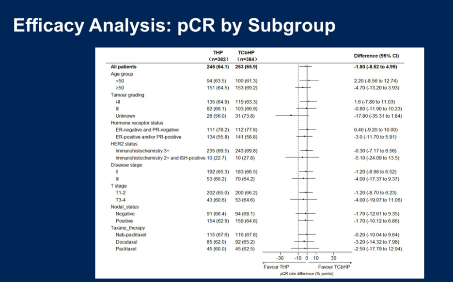 从研究结果来看,THP方案的pCR率非劣效于TCbHP方案(64.1%vs 65.9%,绝对差异:-1.8%,95%CI:-8.5~5.0;优势比0.93,95%CI:0.69~1.25;P=0.0089)。该研究各亚组(不同激素受体状态、肿瘤大小和淋巴结受累情况)pCR结果也与主要终点结果呈现一致性获益。该研究为THP方案的临床应用提供了更为充分的循证医学证据。