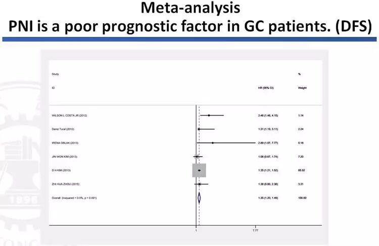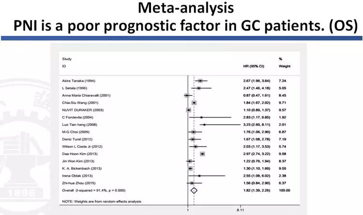 自2003年Duraker N在Surg Today上的报道,PNI已成为其他许多恶性肿瘤,包括胰腺、结直肠癌、前列腺癌和胆道癌的一个关键的病理特征。对于许多恶性肿瘤,PNI是预后不良的标志。因此,它在胃癌中具有同样的作用。荟萃分析发现PNI是胃癌患者包括OS和DFS预后不良的因素。一项荟萃分析纳入15项研究来自亚洲、欧洲、美洲等7706例胃癌患者,发现PNI是显著的预后不良的因素:OS(HR=1.82,95%CI:1.39-2.26,P <0.001);DFS(HR=1.35,95%CI=1.20-1.49,P <0.001)。