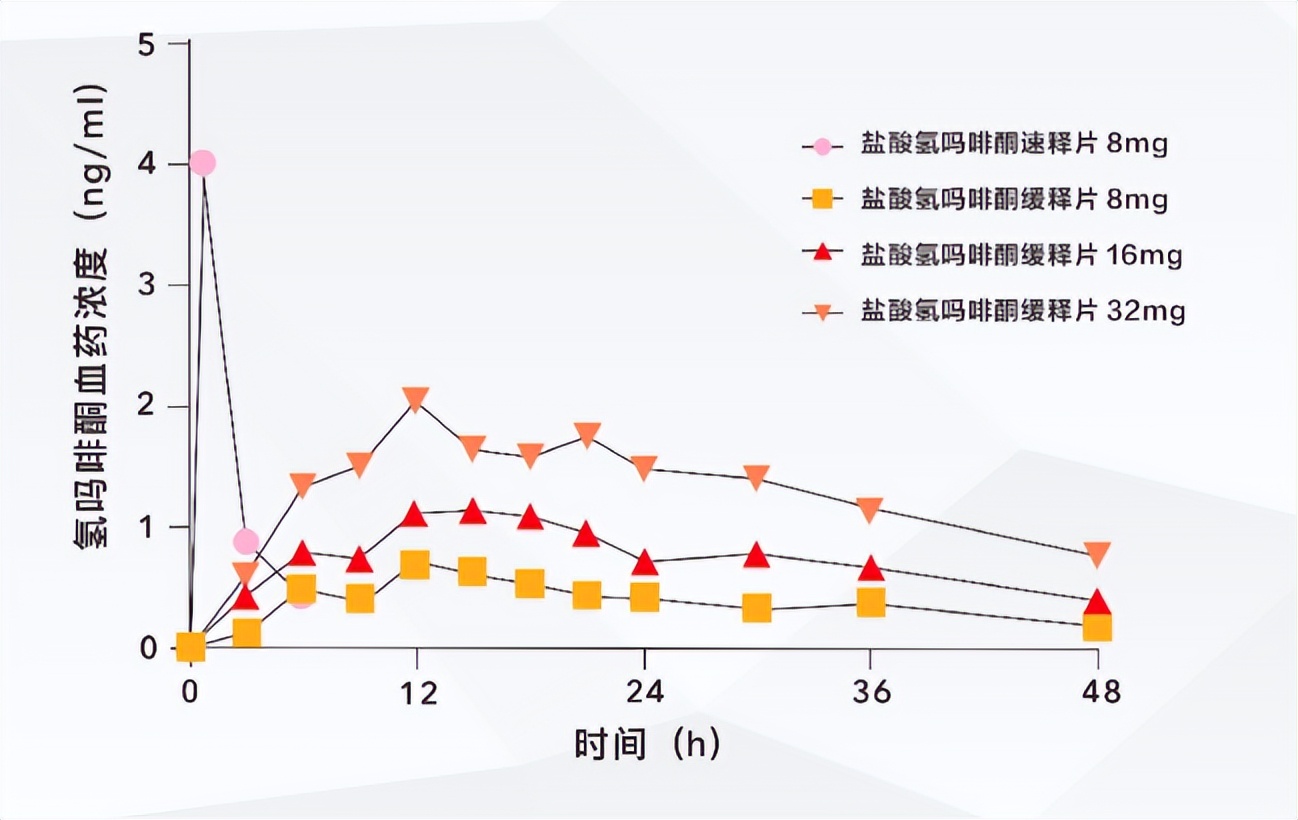 盐酸氢吗啡酮缓释片强效持久,口服效力是吗啡的5-10倍;单次口服后,血药浓度在用药后6-8h逐渐升高,并在约18-24h时保持稳定,其平均Tmax值约为13-16h;每日一次给药,明显减少给药次数,提高患者用药依从性[15](图2)。