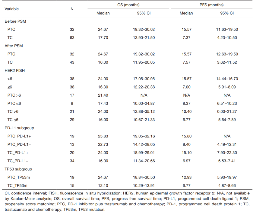 在PSM前,PTC组的中位OS为24.67个月,TC组为17.70个月;中位PFS分别为15.57个月和7.37个月。PSM后,PTC组的中位OS仍显著优于TC组(24.67个月vs.16.00个月,HR=0.4613,P=0.01),中位PFS也显著延长(15.57个月vs.7.57个月,HR=0.4393,P=0.008)(图2)。这表明,在一线治疗中加入PD-1抑制剂可显著改善HER2阳性胃癌患者的生存结局。
