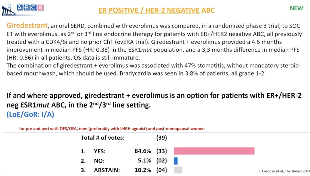 在ESR1突变人群中,Giredestrant联合依维莫司将中位PFS延长了4.5个月(风险比:0.38);在所有患者中,中位无PFS延长了3.3个月(HR 0.56)。OS数据尚不成熟。Giredestrant联合依维莫司治疗方案导致了47%的口炎发生率(试验未强制使用类固醇漱口水,但建议使用)。3.8%的患者出现心动过缓,均为1-2级。