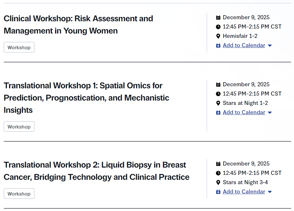 三场研讨会:1、临床研讨会:年轻女性的风险评估和管理;2、转化研讨会1:空间组学技术在肿瘤预测、预后及机制研究中的应用;3、转化研讨会2:乳腺癌的液体活检,新兴技术和临床实践。