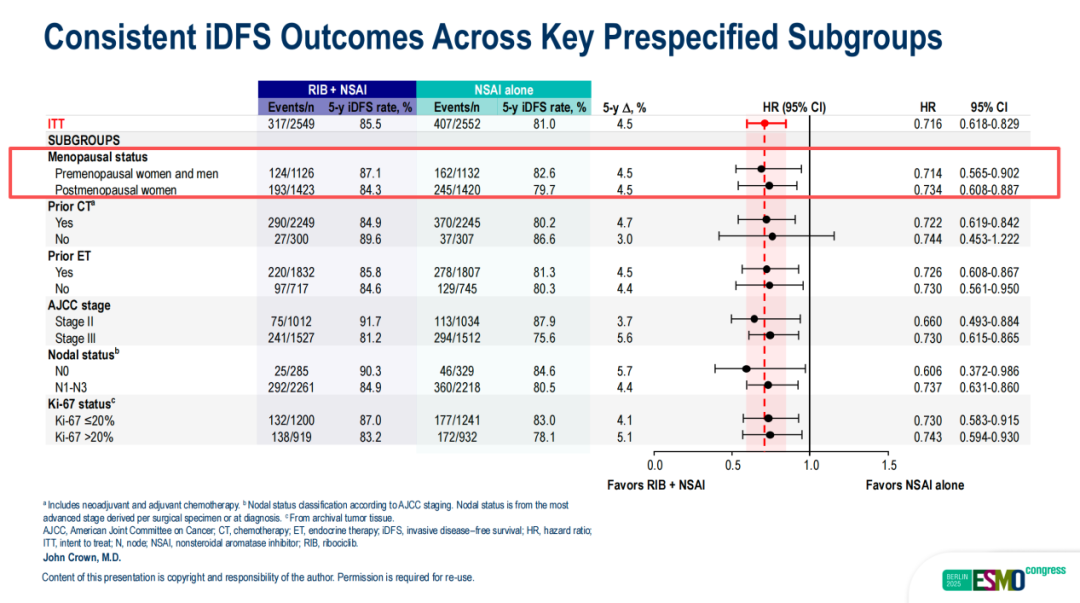 其中,瑞波西利联合内分泌治疗在绝经前人群5年iDFS率达87.1%,较单纯内分泌治疗组提升4.5%,HR值为0.714(CI:0.565-0.902).且无论绝经状态如何,各关键亚组的获益趋势均与总体人群一致[14]