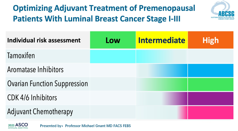 在绝经前HR+/HER2-早期乳腺癌的治疗中,AI联合OFS的强化内分泌方案已成为中高复发风险患者的治疗标准。然而,AI+OFS是否已足够?近年来的关键临床研究,如monarchE和NATALEE,给出了明确答案:在此基础上联合CDK4/6抑制剂,可为II–III期高复发风险患者带来显著的无复发生存获益。来自奥地利科学院院士兼St.Gallen乳腺癌国际共识会议主席的Michael Gnant教授在2025ASCO会议指出CDK4/6抑制剂联合内分泌治疗的目标人群,与适合“AI+OFS”强化治疗的中高复发风险患者高度重合,而传统TAM更适用于低复发风险患者。这清晰地体现了治疗模式正从传统单药内分泌治疗,向基于风险分层的强化治疗演进[12]