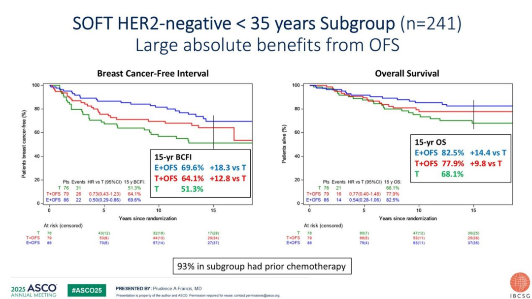 既往接受化疗:在SOFT研究中,接受化疗的患者(中位年龄40岁)使用OFS+依西美坦相较于他莫昔芬单药,在DRFI与OS上分别获得2.1%和4.3%的绝对获益[11]