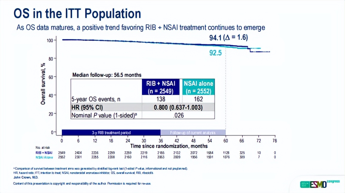 2025年ESMO大会公布的5年随访数据进一步证实,在全部患者均接受AI(绝经前联合OFS)这一最强内分泌背景治疗下,加用瑞波西利仍可带来强效且持久的获益。中位随访55.4个月时,在意向治疗(ITT)人群中,瑞波西利组5年iDFS率达85.5%,显著高于对照组的81.0%,复发风险降低28.4%(HR=0.716)。OS结果显示,瑞波西利组降低5年死亡风险达20%(HR=0.800,P=0.026),并且两组的OS Kaplan-Meier曲线已展现出分离趋势[14]