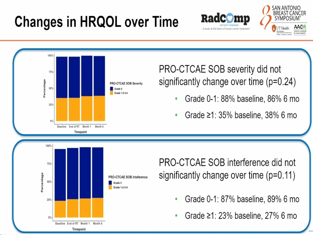 尽管PRO-CTCAE呼吸困难的严重程度(p=0.24)和对日常生活的干扰程度(p=0.11)随时间无显著变化,但胸痛的频率(p<0.001)、严重程度(p<0.001)及对日常生活的干扰程度(p=0.008)较放疗前有轻微加重。所有剂量体积参数均未与任何心脏特异性HRQOL结局呈现显著关联;按病变偏侧分层后结果一致。