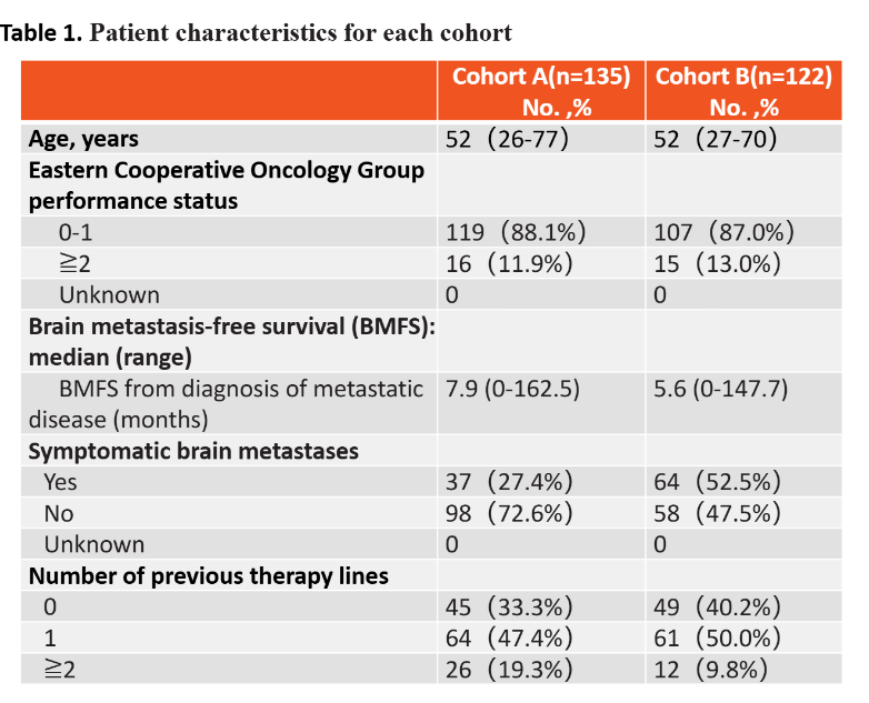 2018年9月至2024年1月,本研究共入组287例患者,其中队列A为135例、队列B为122例。两组患者的活动性脑转移比例分别为88.9%和61.5%,合并中枢神经系统症状的比例分别为27.4%和52.5%。