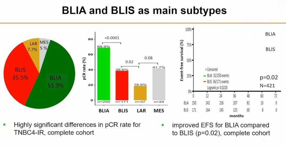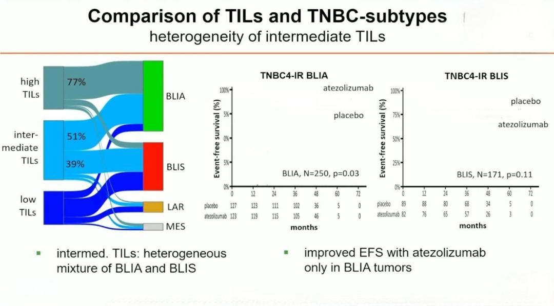 关键发现在于,阿替利珠单抗带来的EFS获益几乎完全集中于BLIA亚型患者中。在中等TILs组内,约51%为BLIA亚型,39%为BLIS亚型;阿替利珠单抗仅在前者中显著延长EFS,而在后者中与安慰剂无异(如图5)。