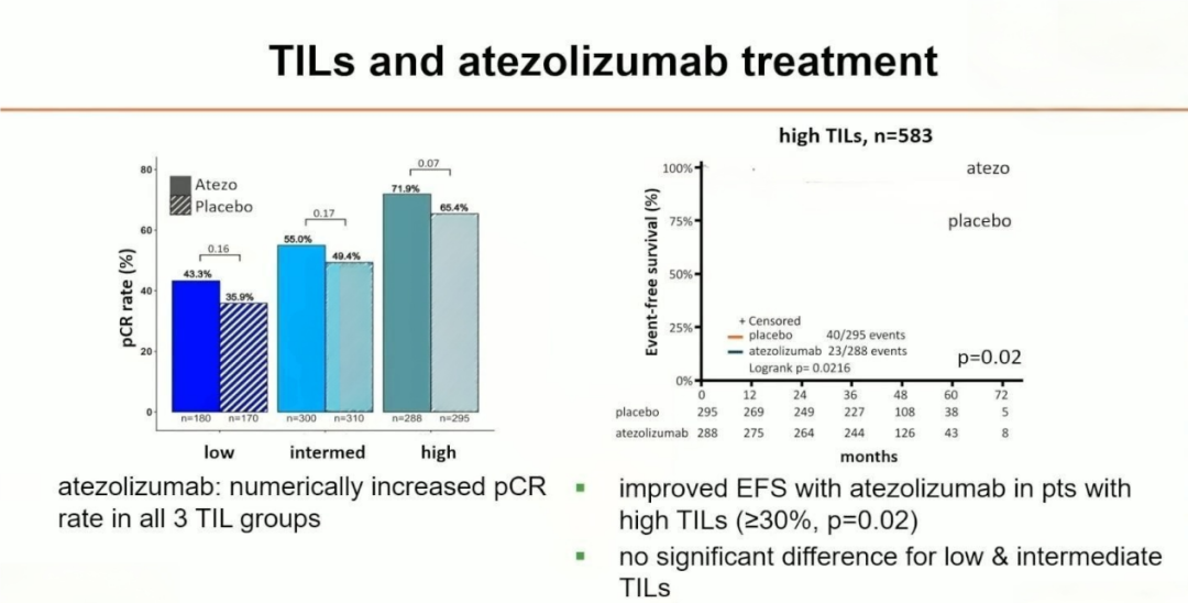 TILs水平能预测免疫治疗的附加获益。在高TILs亚组中,加用阿替利珠单抗相较于单纯化疗,能将pCR率从65.4%提升至71.9%,并带来具有统计学差异的EFS改善。然而,在低TILs及中等TILs(10-30%)亚组中,阿替利珠单抗的增效作用有限(如图3)。