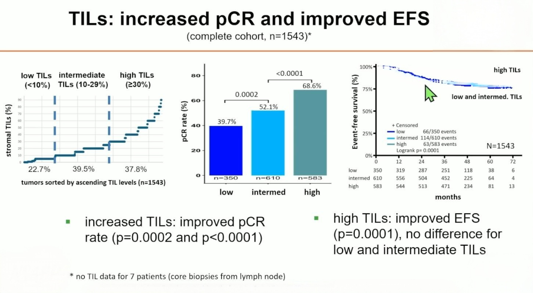 研究结果提示,TIL表达水平越高,患者pCR获益越明显。在高TILs组中,患者的pCR率为68.6%,显著高于低TILs组39.7%的pCR率。此外,高TILs组的EFS也明显优于低TILs组,显示出TILs在抗肿瘤反应中的重要作用(如图2)。