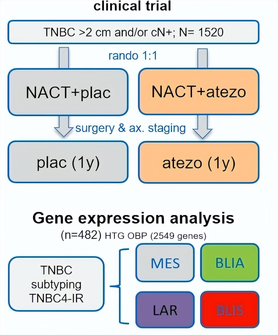 研究纳入了1520名TNBC患者[肿瘤直径>2cm和/或临床淋巴结阳性(cN+)]。这些患者被随机分配到接受新辅助化疗加安慰剂或新辅助化疗加阿替利珠单抗的治疗组。为了评估免疫治疗的效果,研究者对所有患者的TILs水平进行了分组,并进一步分析482名患者的基因表达(如图1)。