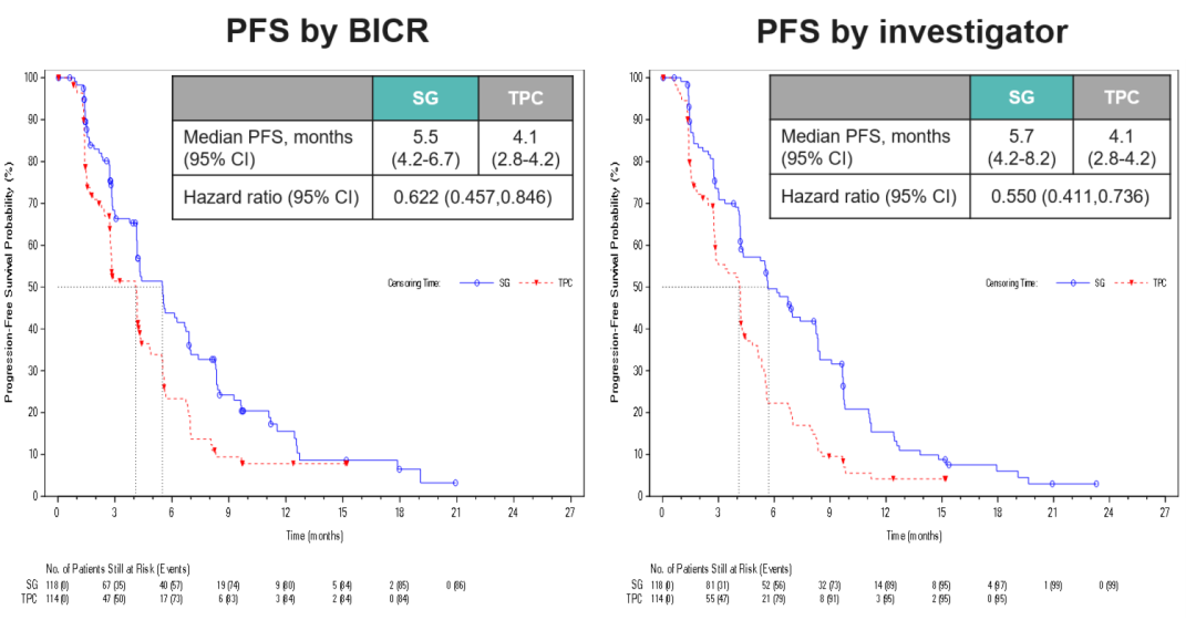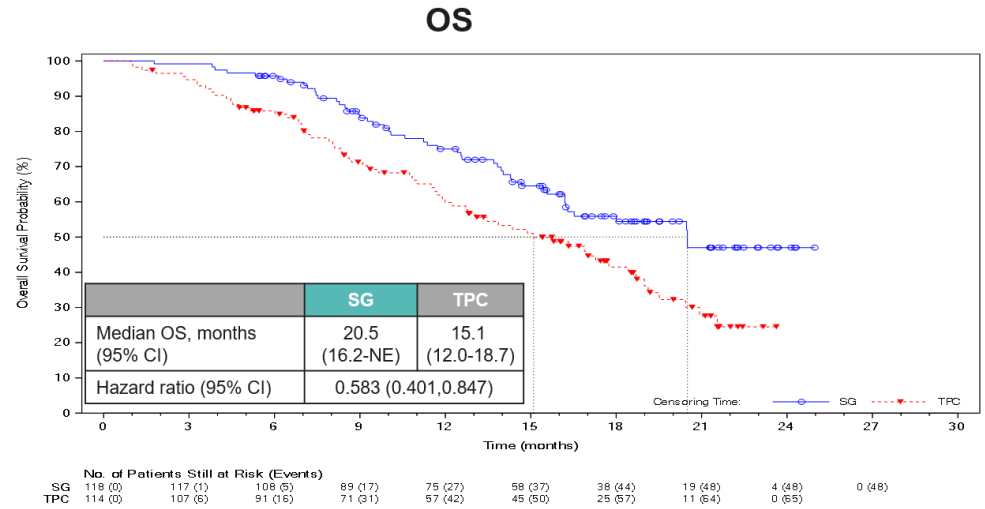 2025年年中欧洲肿瘤内科学会靶向抗癌亚洲大会(ESMO TAT Asia)发布了EVER-132-002研究中国大陆人群数据。中国大陆患者的回顾性亚组中共有232例患者,约43%的患者为CDK4/6i经治,约56%的患者在转移阶段既往接受过2线化疗。结果显示,SG较TPC改善了BICR评估的mPFS,为5.5个月vs 4.1个月(HR 0.622,95%CI:0.457-0.846)。在OS方面,SG较TPC同样取得了有临床意义的改善,为20.5个月vs 15.1个月(HR 0.583,95%CI:0.401-0.847),降低了41.7%的死亡风险,较全人群降低死亡风险程度具有更大获益的趋势。安全性方面,中国大陆人群与全人群表现一致,以血液学毒性、腹泻为主,具有较好的耐受性和可控的安全性[11]
