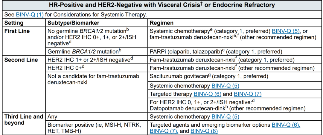 《NCCN指南》对内脏危象或内分泌难治的晚期复发HR+/HER2-乳腺癌推荐方案