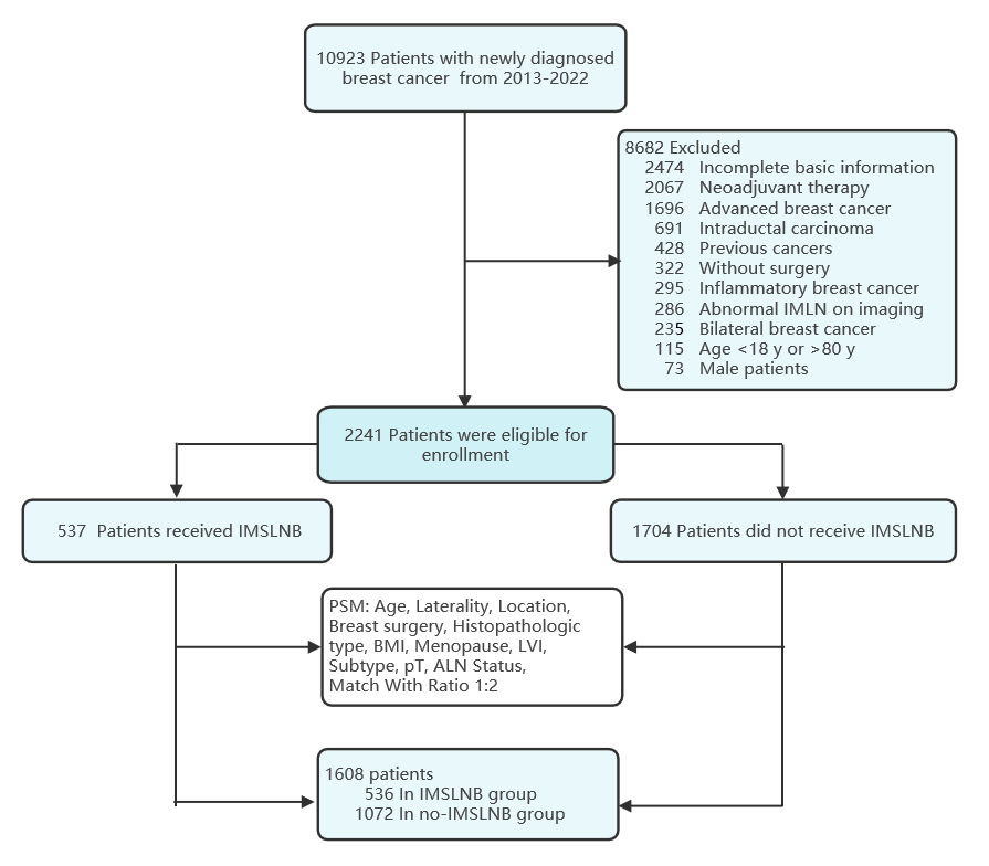 本研究为单中心回顾性队列研究,收集2013年1月1日至2022年12月31日来自山东第一医科大学附属肿瘤医院的10923例乳腺癌患者。纳入标准:女性、年龄18-80岁、疾病分期I-III期,接受乳腺癌手术(包括乳房切除术或保乳手术)。排除标准包括:临床病理资料不完整、内乳淋巴结(IMLN)影像学异常、术前远处转移、炎性乳腺癌、新辅助治疗、仅导管原位癌、双侧乳腺癌、外院接受乳腺癌手术、既往恶性肿瘤史、胸部手术及放疗史。本研究应用倾向性评分匹配后(1:2),最终1608例患者纳入分析,分为内乳前哨淋巴结活检(IMSLNB)组(536例)和no-IMSLNB组(1072例)。主要研究终点是无病生存期(DFS),次要终点为总生存期(OS)、无区域复发生存期(RRFS)、无局部复发生存期(LRFS)、无远处转移生存期(DMFS)。